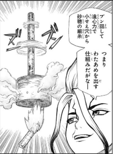 綿飴(わたあめ)機 引用:週刊少年ジャンプ2018年17号 中央に砂糖をいれ、遠心力で小さな穴から極細の砂糖の糸、わたあめを出す仕組み。 砂糖の代わりに金を入れると金の極細線をつくることができる。 引用:週刊少年ジャンプ2018年18号 当初つくったものは、…